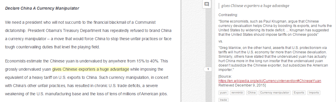 One core property of open annotation is that annotation doesn’t require cooperation of the host of a website. However, nothing is changed on the host either; the annotations are only visible through the annotation tool. For example, when Donald Trump talks about China as a currency manipulator, one can add this annotation to reference Wikipedia: