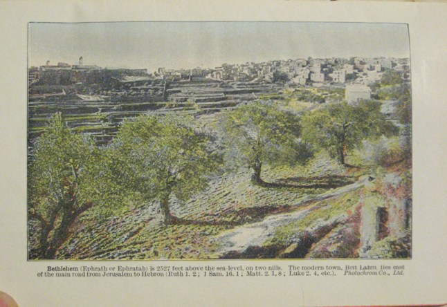 “Bethlehem (Ephrath or Ephratah) is 2527 feet above the sea-level, on two hills. The modern town. Beit Lahm lies east of the main road from Jerusalem to Hebron (Ruth 1.2; 1 Sam. 16.11; Matt. 2.1, 8; Luke 2.4 etc.)”