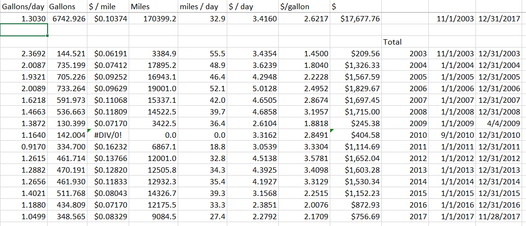 I got a new row for 2010 set up. But 2010 had $0.00 spent and 0.000 gallons and wouldn’t show what I expected. It was very frustrating. I was trying to force Excel to do-the-right-thing and calculate those values and it refused to. Matrix formulas were a new to me, so I thought it must be some subtle Excel flaw. (Thinking along the lines of it’s someone else’s fault.)