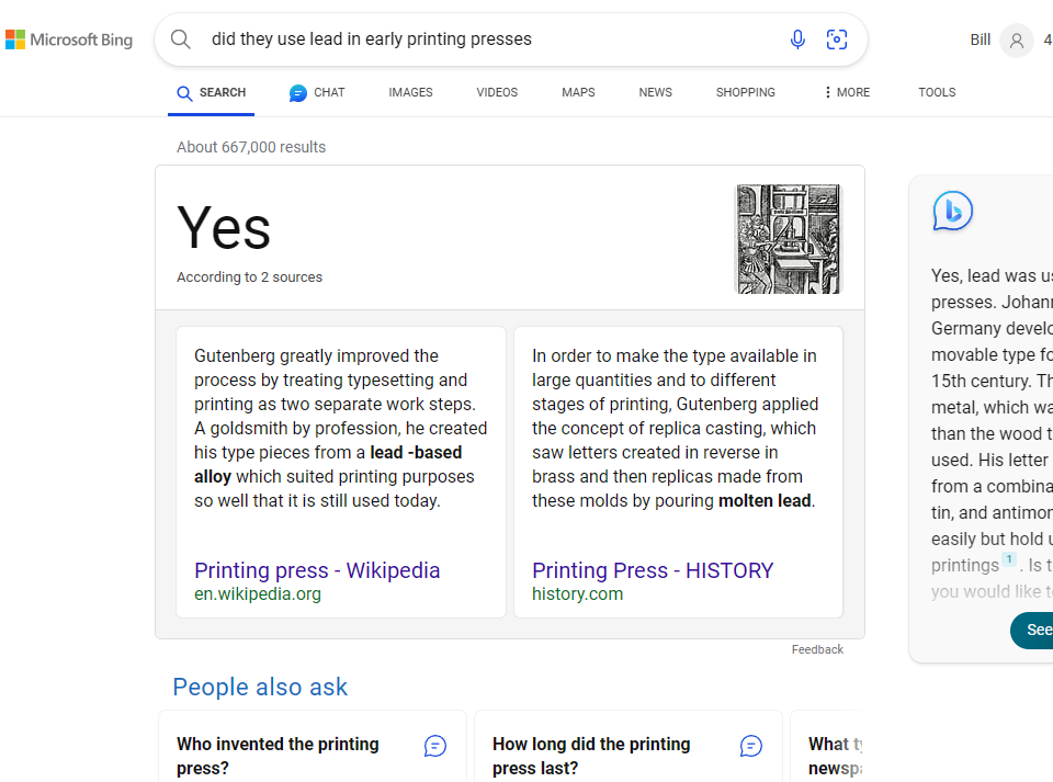 The next technology I thought about that would have been affected by lead’s toxicity is the printing press. I remembered that lead was used in the type slugs used in the printing press. I asked Bing to verify that Gutenberg used lead and it came back with an emphatic: